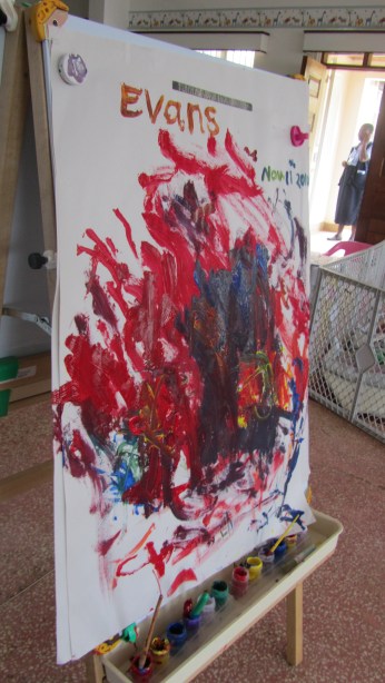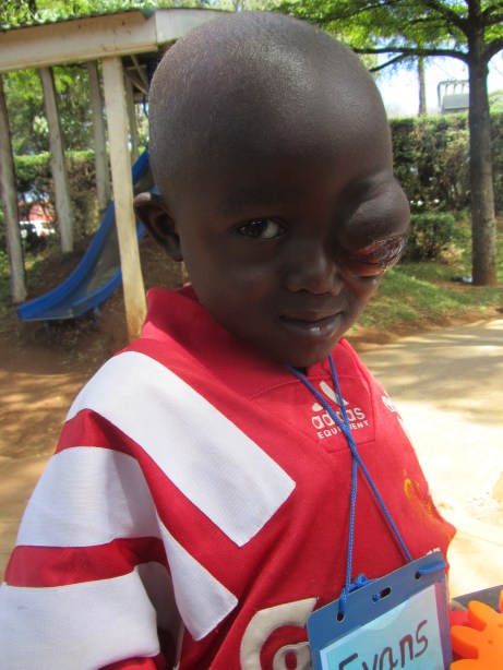 He was wearing a red soccer jersey. He was short, maybe four years old. He went straight to the easel, something few of the children did. He was surprisingly into his painting, using all of the colors and creating a picture that, if called abstract and modern, could probably sell on eBay for a few thousand dollars. His back was to me, but I could tell that he was a new patient in the hospital and so went over to talk to him. I knelt down by his side and said “sasa!” (“what’s up?” in Swahili). He turned to look at me, smiling. It looked as if a tennis ball had been forced underneath his skin where his eye should have been; you could no longer see the eyeball, but stretched around the mass were his eyelids, in which soft, black eyelashes still rested. He had retinoblastoma, a cancer in the eye which causes his eye to be very enlarged, infected, and painful. His name was Evans.