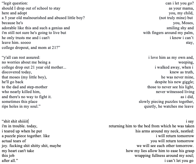 *The words in the left column are excerpts from facebook messages written to friends and family during the summer of 2014, during which, while working at Sally Test Pediatric Center in Eldoret, Kenya, I cared for and loved as my own child a four-year-old named Moses before he returned to an abusive home and I returned to the United States.